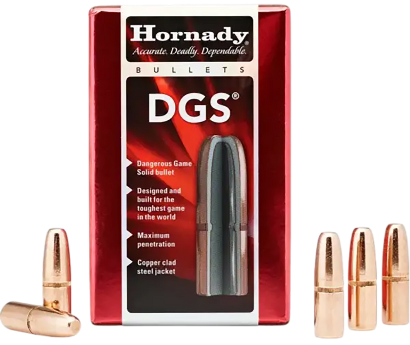 Hornady DGS (Dangerous Game Solid) bullets in 9.3mm caliber (.366 diameter) are designed for rifle reloading, specifically for dangerous game hunting applications. Each box contains 50 bullets weighing 300 grains with a sectional density of .320, featuring a copper-coated steel jacket and lead core with cannelure. These solid bullets deliver deep penetration and reliable performance on large game.