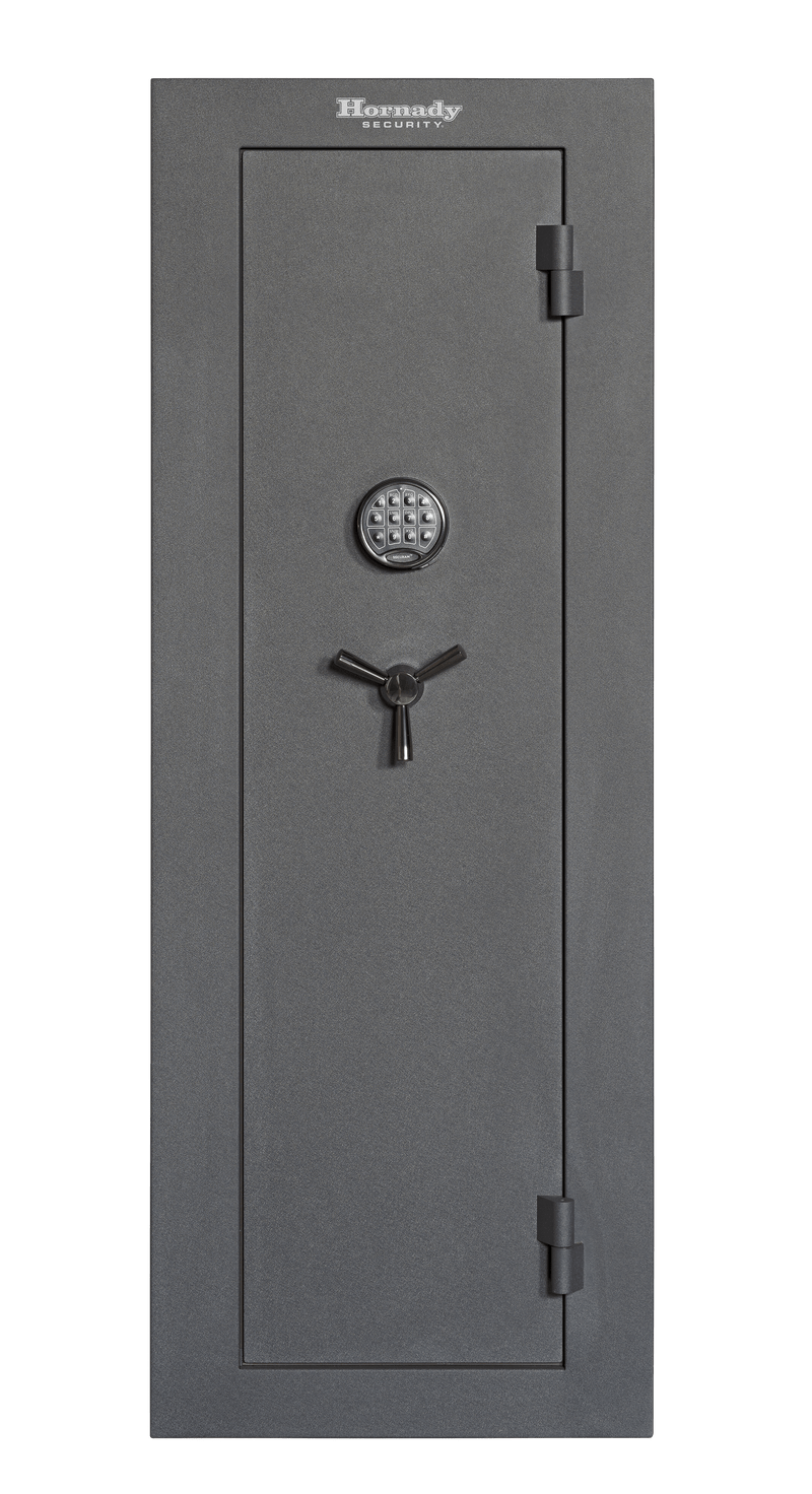 The Hornady Mobilis is a fireproof safe constructed from 9 gauge steel with a matte grey powder coated finish designed to securely store firearms and valuables. This safe provides both fire protection and theft deterrence for home or office use. The robust steel construction and fireproof rating make it suitable for long-term storage of firearms and important documents.