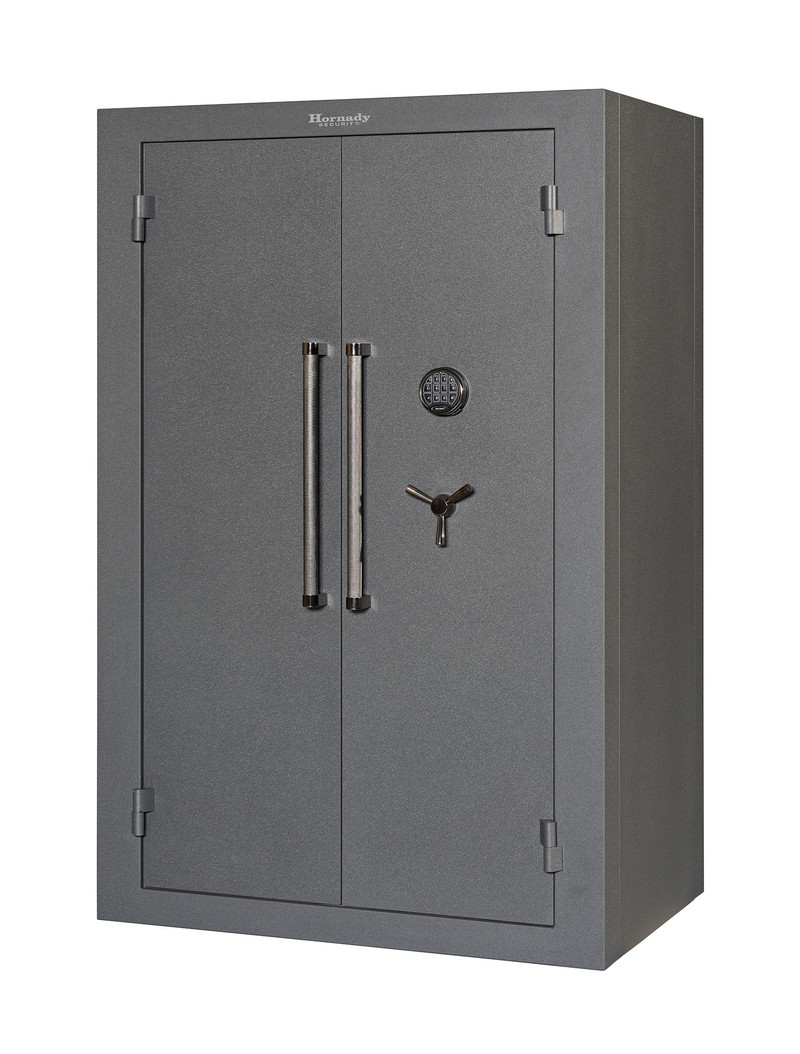 The Hornady Mobilis Double Door Max is a heavy-duty gun safe constructed from 9-gauge steel, designed for secure storage of firearms and valuables. Weighing 1,027 lbs, this double-door safe provides maximum capacity and accessibility for serious collectors and gun owners. The matte grey finish offers a professional appearance suitable for home or business environments.