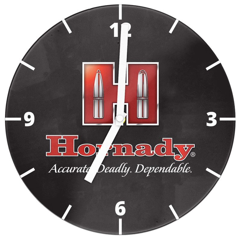 The Hornady H Clock is an 18.7-inch wall clock designed for firearm enthusiasts and hunters. Features a black and red color scheme with classic styling suitable for display in workshops, garages, or outdoor spaces. Dimensions are approximately 18.7 inches long by 18.4 inches wide.