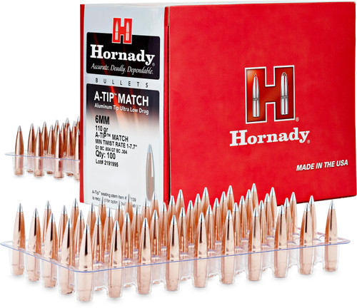 Hornady A-Tip Match bullets feature a precision-machined aluminum tip designed to enhance in-flight stability and reduce drag for superior match-grade performance. Each box contains 100 bullets with a .243" diameter and 110 grain weight, constructed with a lead core and copper jacket. These bullets are engineered for target and precision rifle applications and require a specialized A-Tip seating stem for optimal performance.