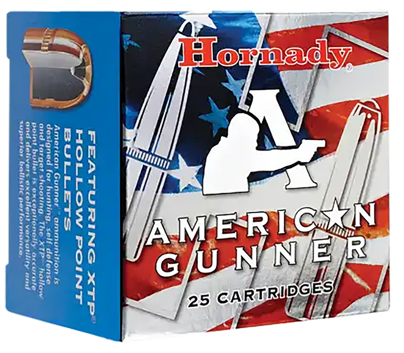 Hornady American Gunner .357 Magnum ammunition loaded with 125 grain XTP (eXtreme Terminal Performance) hollow point bullets. Delivers 1500 fps muzzle velocity and 624 ft-lbs of energy, offering controlled expansion and deep penetration ideal for personal defense and target shooting applications.
