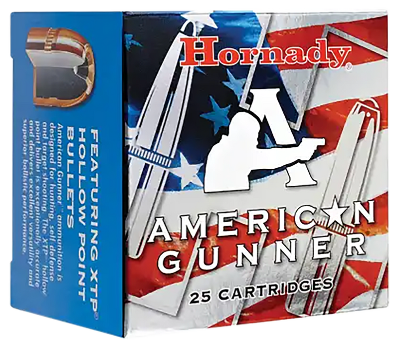 Hornady American Gunner .38 Special ammunition features 125-grain Jacketed Hollow Point (XTP) bullets loaded to 900 fps with 225 ft-lbs of muzzle energy. Designed for self-defense and target shooting, this ammunition uses premium brass casings for reliable feeding and reloadability. Made in the USA with generations of ballistics expertise.