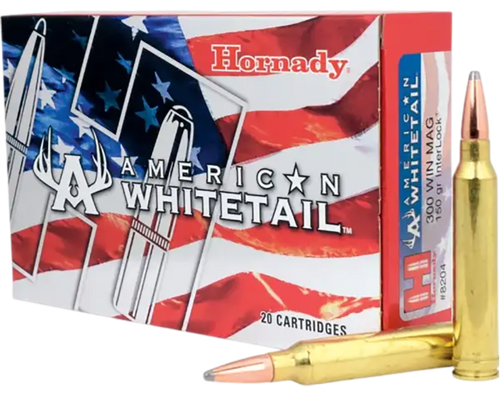 Hornady American Whitetail 7mm Remington Magnum ammunition features 154-grain InterLock Spire Point bullets with brass casings, delivering 3,035 fps muzzle velocity and 3,149 ft-lbs of energy. Optimized specifically for deer hunting, the InterLock bullet technology maximizes energy transfer and penetration for consistent performance. Packaged 20 rounds per box with 10 boxes per case.