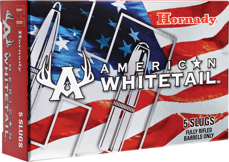 Hornady American Whitetail shotshell ammunition in 12 gauge 2.75" with 325-grain InterLock rifled slugs designed for fully rifled barrels. Loaded to 1825 fps, these slugs feature a hollow point serrated design for rapid expansion and are effective on whitetail deer out to 200+ yards.