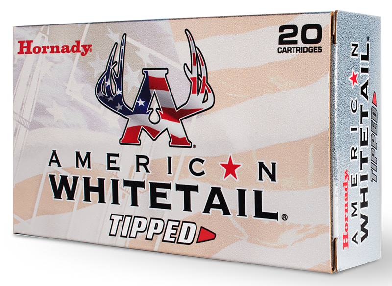 Hornady American Whitetail Tipped ammunition in 7mm-08 Remington with 139-grain SST bullets designed for hunting. Features a polymer tip that drives into the bullet's lead core with an InterLock ring to lock the core and jacket together during expansion for retained mass and energy. Loaded to 2860 fps muzzle velocity, delivering 2471 ft-lbs of energy, packaged 20 rounds per box with brass casings.