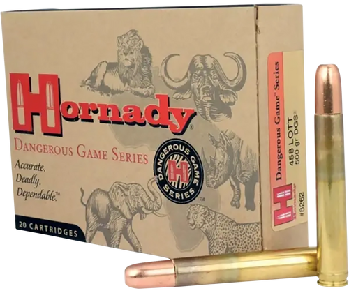 Hornady Dangerous Game Series centerfire rifle ammunition in 470 Nitro Express, loaded with 500 grain Dangerous Game Solid (DGS) bullets. Delivers 2150 fps muzzle velocity and 5132 ft-lbs of energy, engineered for maximum penetration on dangerous game with hard antimony-lead alloy construction and copper-steel jacket. Sold 20 rounds per box, 6 boxes per case.