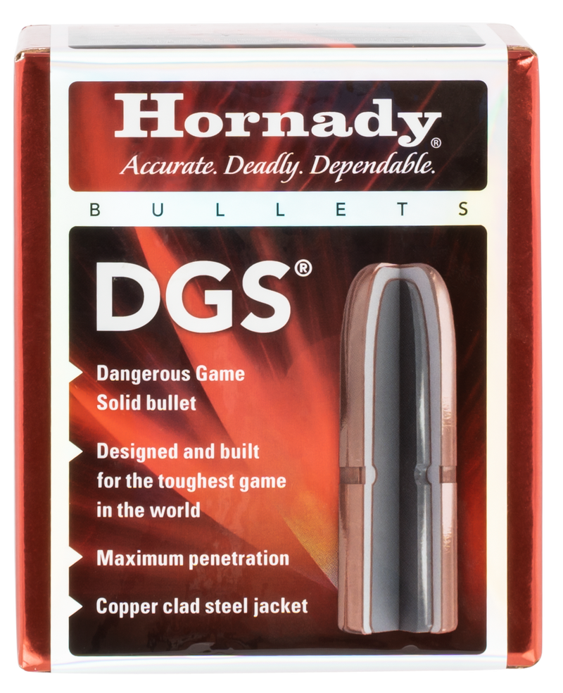 Hornady DGS (Dangerous Game Solid) bullets are designed for dangerous game hunting with a 500 grain full metal jacket round nose configuration in .458 caliber. These jacketed lead bullets feature a copper jacket with a high antimony lead core, engineered for controlled expansion and deep penetration through heavy bone. Sold in boxes of 50 rounds per box with 15 boxes per case.