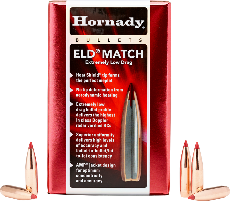 Hornady ELD Match bullets are precision reloading projectiles featuring Extremely Low Drag design with Heat Shield tips and optimized meplat geometry for superior ballistic coefficients and accuracy. Each box contains 500 bullets weighing 140 grains and is designed for target and match shooting applications. These bullets deliver exceptional consistency from round to round and lot to lot.