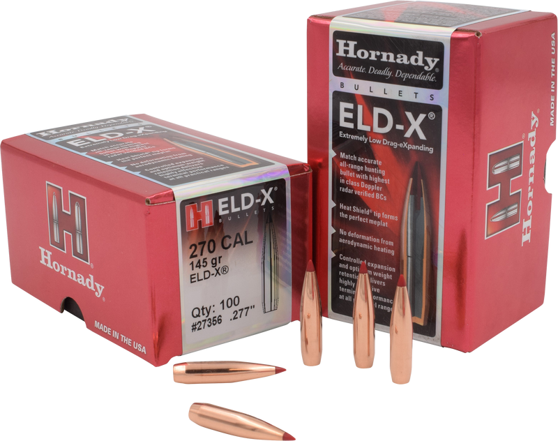 Hornady ELD-X bullets are match-accurate hunting rounds featuring a heat shield polymer tip designed to prevent tip melt in flight, delivering consistent controlled expansion at all practical hunting distances. These .277" diameter, 145 grain projectiles offer a ballistic coefficient (G7) of .270 and sectional density of .270, making them suitable for long-range hunting applications. Each box contains 100 bullets with a jacketed lead construction and copper coating.