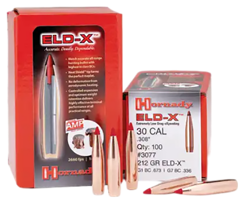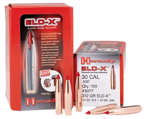 Hornady ELD-X (Extremely Low Drag - eXpanding) bullets are technologically advanced hunting bullets featuring high ballistic coefficients (.673 G1, .336 G7) and consistent controlled expansion at practical hunting distances. These .308 diameter, 212 grain jacketed lead bullets with polymer tips are designed for rifle reloading and come in boxes of 100 with 15 boxes per case. The sectional density of .319 and lead core with copper jacket construction make them suitable for medium to large game hunting applications.