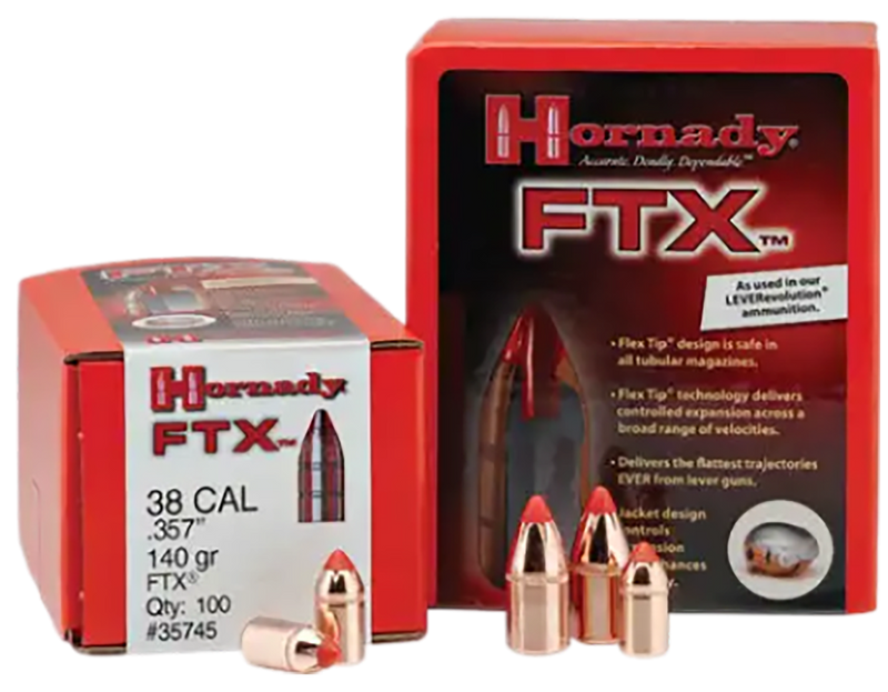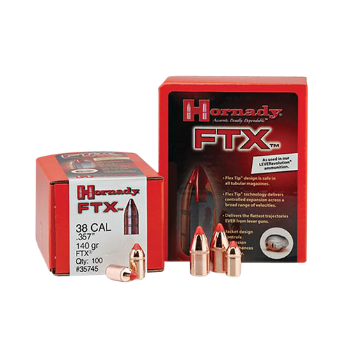 Hornady FTX .500" diameter 300 grain reloading bullets feature patented Flex Tip technology that compresses upon impact to enable reliable expansion across a wide range of velocities. These jacketed lead bullets with polymer tips are designed for both handgun and rifle applications, particularly lever action rifles. Sold in boxes of 50 rounds with a cannelure for secure case seating.
