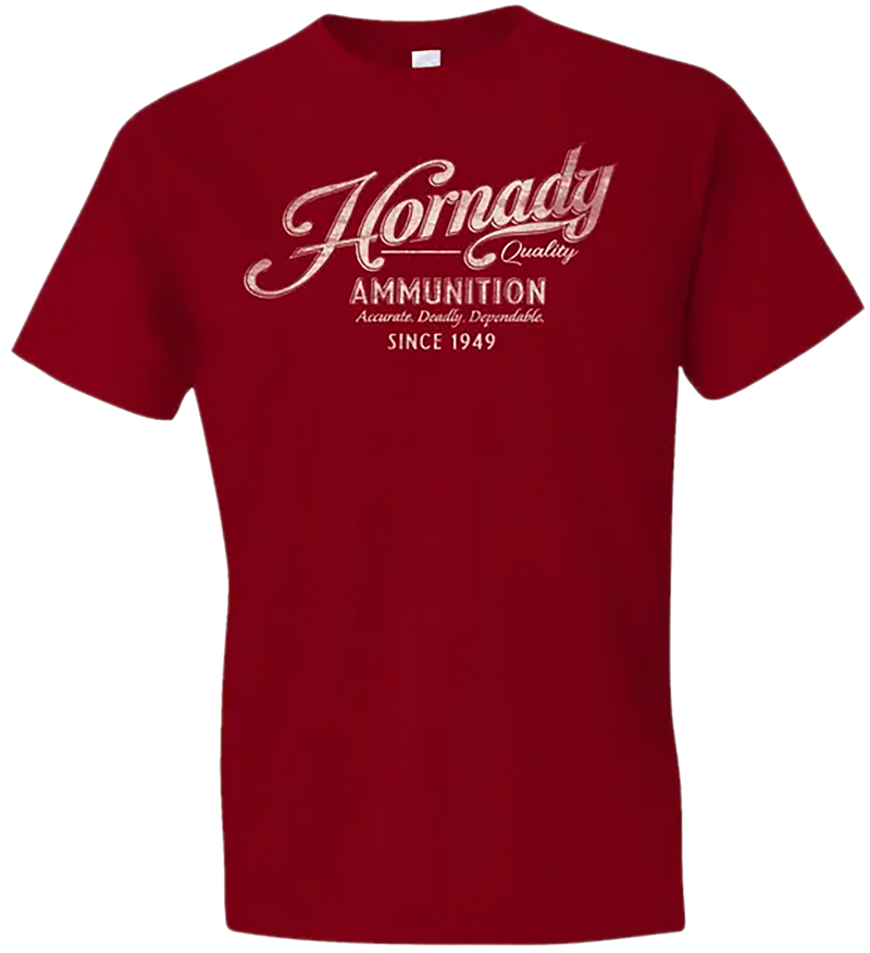 Semi-fitted cotton t-shirt in red with Hornady Gear vintage script design. Available in size 2XL with a comfortable cotton construction suitable for casual wear or range activities.