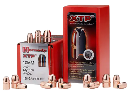Hornady XTP hollow point handgun bullets designed for hunting, self-defense, and competitive shooting applications. Features reliable expansion across a wide range of handgun velocities with deep penetration characteristics. Packaged as 100 bullets per box with a jacketed lead construction.
