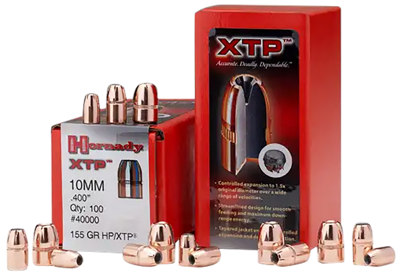 Hornady XTP hollow point bullets in .44 caliber (.430 diameter) designed for handgun reloading, hunting, and self-defense applications. These jacketed lead bullets feature reliable expansion across a wide velocity range and are known for consistent accuracy and stopping power. Sold in boxes of 100 rounds with 15 boxes per case.