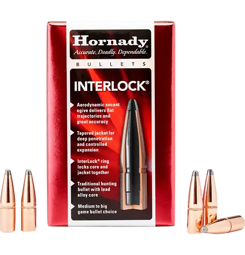 Hornady InterLock bullets are jacketed lead projectiles designed for rifle reloading in .30 caliber applications. Featuring a 170-grain flat point design with Hornady's trademarked InterLock ring system that locks the core and jacket together during expansion, these bullets deliver reliable weight retention and controlled expansion for big game hunting. Each box contains 100 bullets with a cannelure for secure seating.