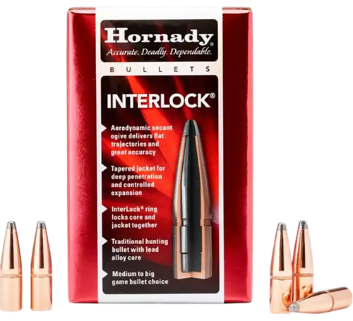 Hornady InterLock bullets feature a one-piece core and jacket design with a trademarked InterLock ring system that keeps the core and jacket locked together during expansion for reliable performance on big game. These .308 caliber, 220 grain round nose bullets come packaged 100 per box and are designed for rifle reloading applications. The bullets feature a lead core with copper jacket construction and deliver outstanding weight retention and controlled expansion.