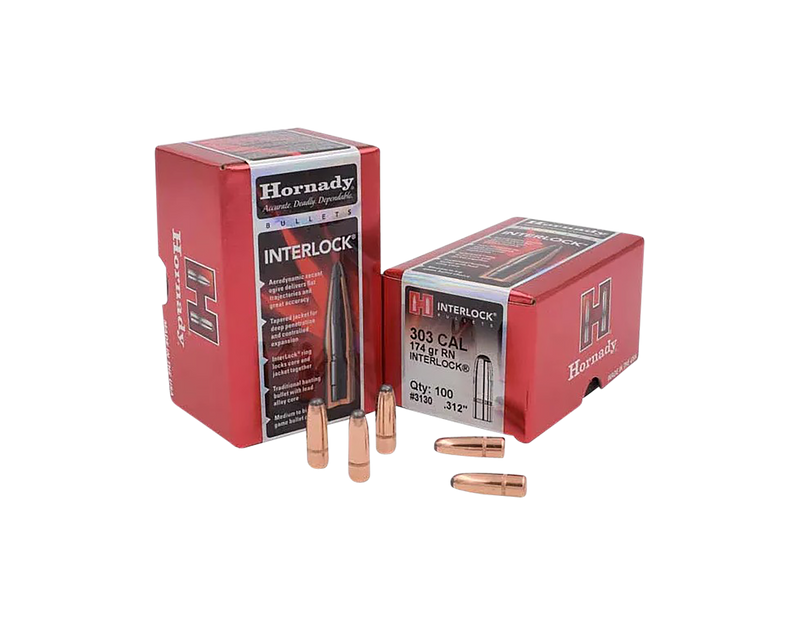 Hornady InterLock bullets are jacketed lead projectiles designed for .303 caliber rifle reloading, featuring a 174 grain round nose profile and the trademarked InterLock ring system that locks the core and jacket together during expansion. Each box contains 100 bullets and is backed by Hornady's proven performance for big game hunting applications. These bullets offer excellent weight retention and controlled expansion for hunting purposes.