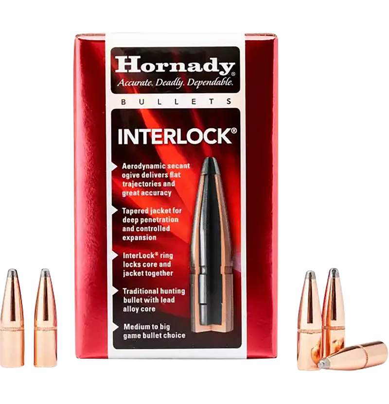 Hornady InterLock bullets feature a one-piece core and jacket design with the trademarked InterLock ring system that keeps the core and jacket locked together during expansion for reliable weight retention. These 139 grain spire point bullets in 7mm .284 caliber are designed for big game hunting with controlled expansion and excellent ballistic performance. Sold in boxes of 100 bullets.
