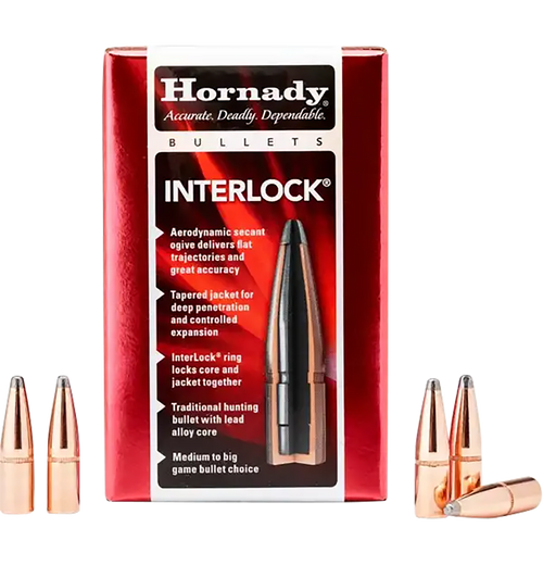 Hornady InterLock bullets feature an exposed lead tip for controlled expansion and hard-hitting terminal performance, with a secant ogive design for ballistic efficiency. The InterLock design uses a raised ring inside the jacket that embeds in the bullet core to keep them locked together during expansion for mass and energy retention. Each box contains 100 rounds and is designed for rifle reloading applications.