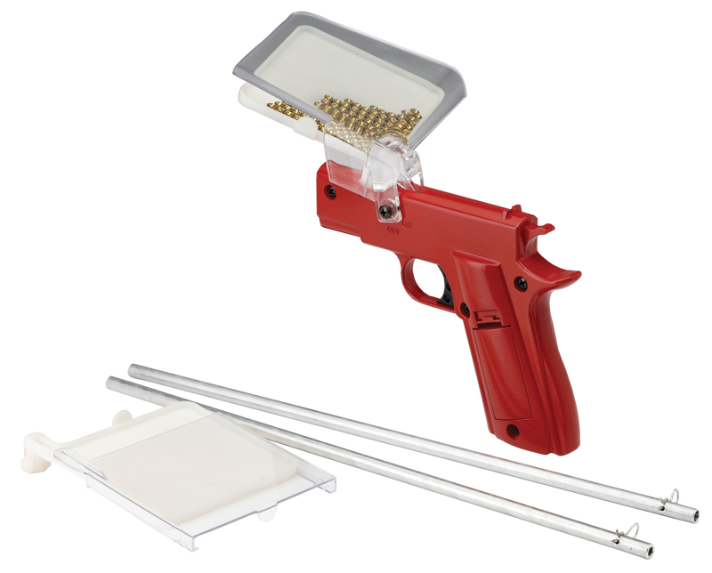 Battery-powered primer tube filler that fills a 100-count primer tube in 10-15 seconds. Features an ergonomic handle positioned at an optimum angle for safe primer feeding. Operates on 2 AAA batteries and is compatible with any primer tube.