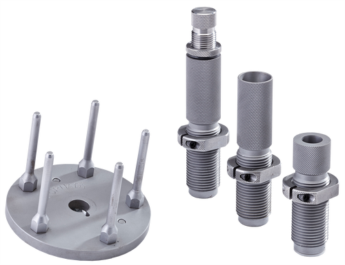 This primer pocket swage tool quickly and cleanly removes crimps from cartridge case primer pockets using a swaging method instead of cutting, which eliminates trimmings and mess. Swage depth is adjustable to accommodate various case brands and is designed for use with any compatible single stage press. The tool comes with a case handle and shell holder.
