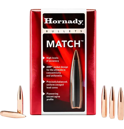 Hornady Match bullets are precision reloading projectiles engineered for target and match rifle applications. Each bullet features a .224" diameter hollow point boat tail design with a lead core and copper jacket, manufactured using an advanced process for consistent concentricity and minimal wall thickness variation. Sold in boxes of 100 rounds per box, 40 boxes per case.