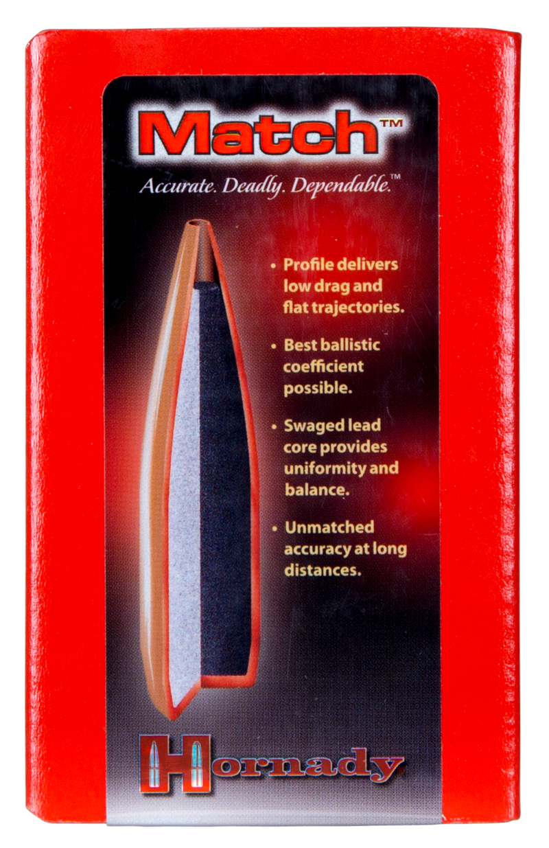 Hornady Match bullets feature advanced AMP (Advanced Manufacturing Process) jackets designed for exceptional concentricity and consistency in precision rifle applications. These .308 caliber, 155-grain hollow point boat tail projectiles deliver a ballistic coefficient of .405 and sectional density of .233, making them ideal for target shooting and match competitions. Packaged with 100 bullets per box.