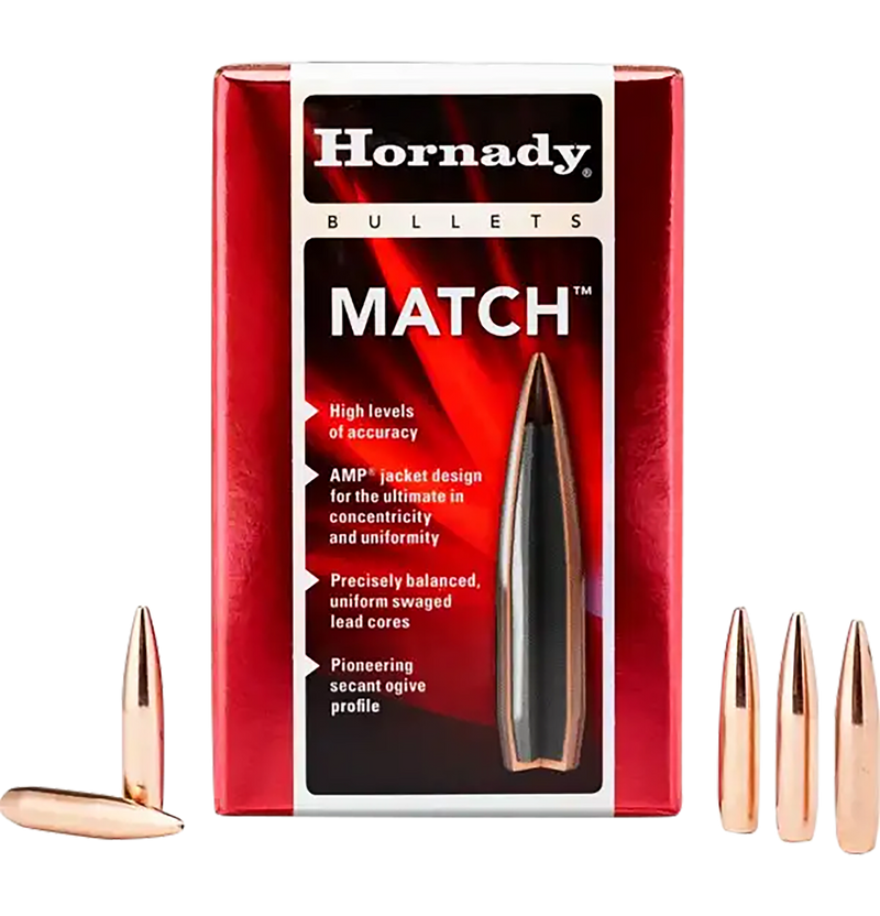 Hornady Match bullets are precision-engineered reloading projectiles featuring advanced manufacturing for consistent concentric jackets and minimal wall thickness variation. These 140 grain boat tail hollow point bullets in .264 diameter are designed for 6.5mm rifle cartridges and come in boxes of 100 rounds. The lead core and copper jacket construction delivers the accuracy required for match-grade ammunition.