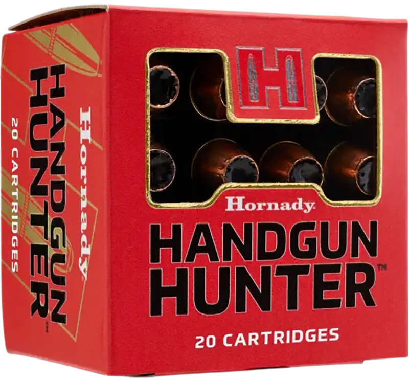 Hornady Handgun Hunter ammunition in 9mm Luger +P with 115-grain MonoFlex bullets designed for hunting applications. Features a tough copper alloy projectile that achieves 95% weight retention and deep penetration with expansion aided by elastomer material in the bullet cavity. Loaded to 1100 fps muzzle velocity producing 309 ft-lbs of energy, with brass casing and boxer primer.