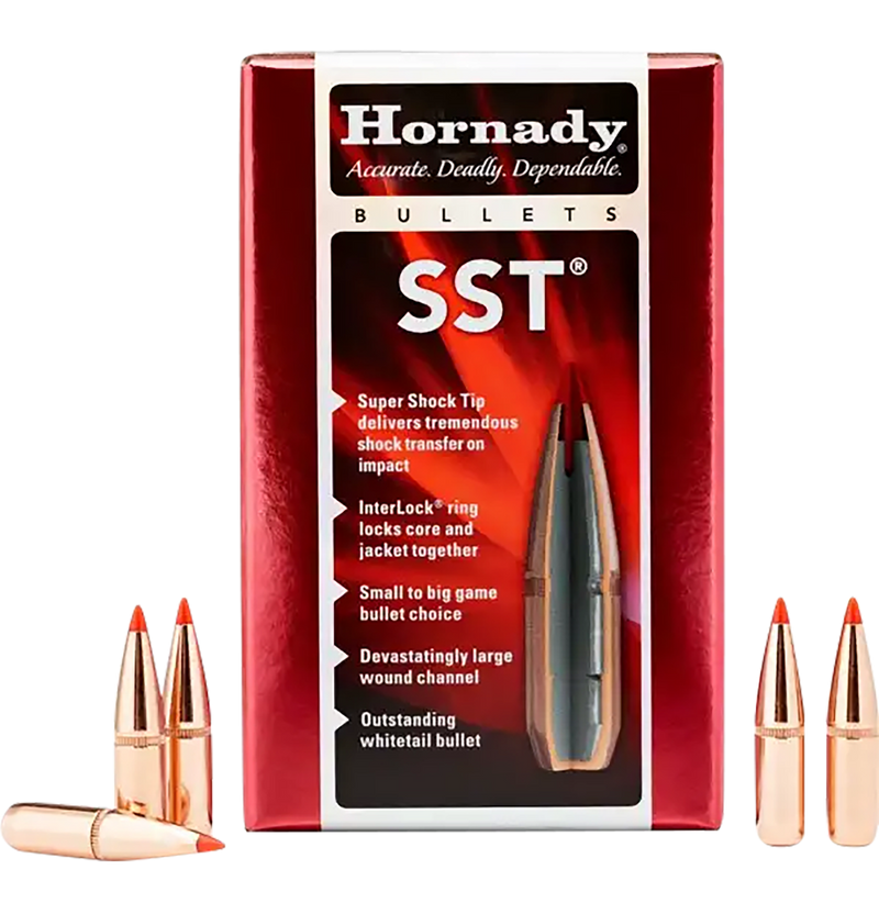 Hornady SST (Super Shock Tip) bullets in .338 caliber with a 200 grain weight, designed for rifle reloading. These polymer-tipped, copper-jacketed lead core bullets feature a cannelure and deliver rapid expansion at higher velocities. Ideal for hunting North American game from antelope to moose, sold in boxes of 100 rounds.