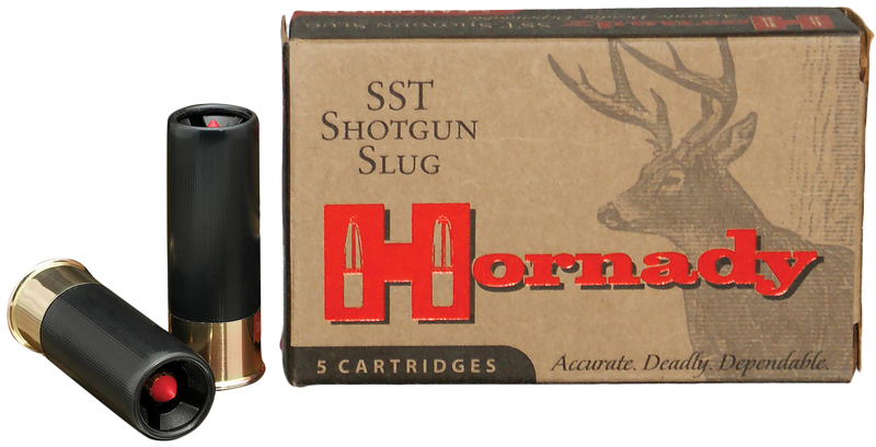 Hornady SST shotgun slugs in 12 gauge 2.75" with 300 grain FTX sabot projectiles designed for hunting. These slugs deliver superior accuracy with sub-2" groups at 100 yards and feature a flattest-in-class trajectory, loaded to 2000 fps muzzle velocity in plastic hulls.