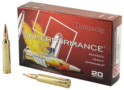 Hornady Superformance centerfire rifle ammunition in 7mm Remington Magnum with 162-grain Super Shock Tip bullets. Delivers 3030 fps muzzle velocity and 3302 ft-lbs of energy, with brass casings and Boxer primers for reliable hunting performance.