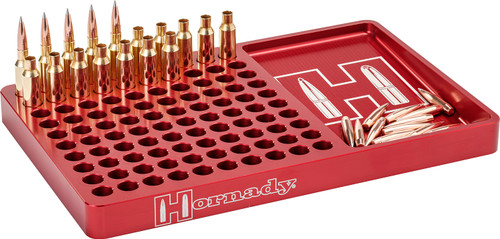 The Hornady Universal Loading Block is a double-sided reloading accessory that holds 50 cartridge cases and facilitates powder charging and case inspection. It accommodates .223 Remington, .308 Winchester, and magnum case head sizes, and is compatible with the Hornady Fast Load Powder Measure Stand. The block features red plastic construction and measures 7.0" x 5.9" x 1.1".