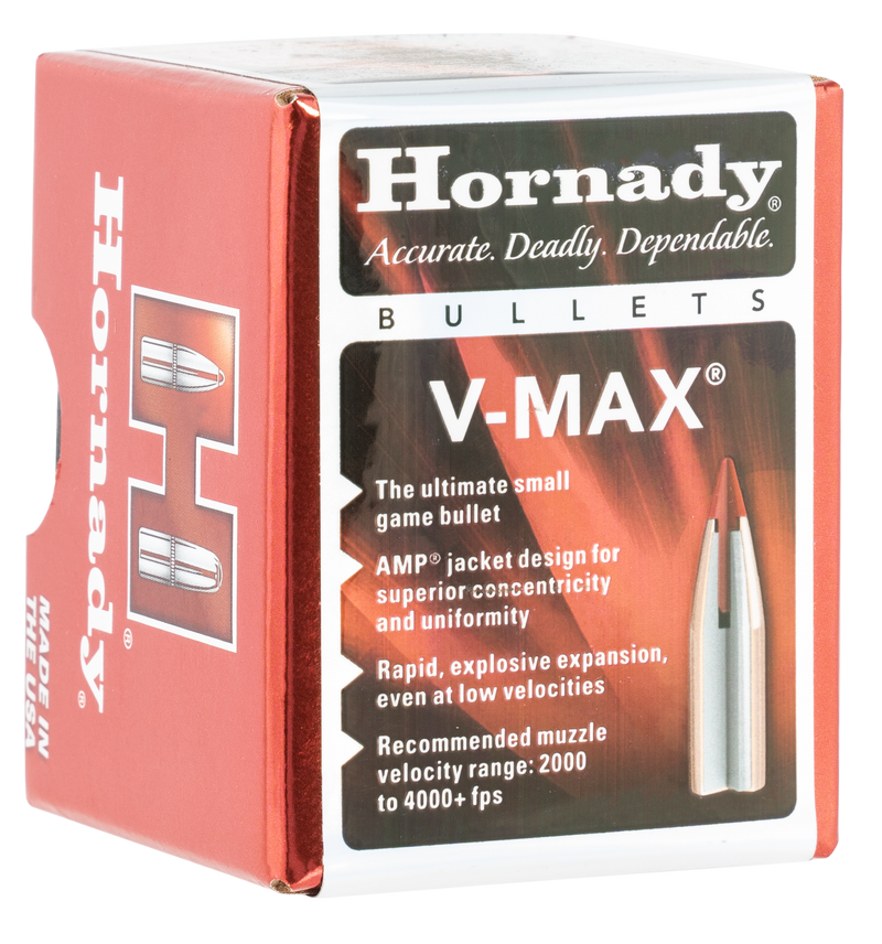 Hornady V-Max bullets in 17 caliber feature a polymer tip that increases ballistic coefficient and initiates expansion at velocities as low as 1600 fps. These jacketed lead bullets have a swaged lead core for precise formation and are designed for varmint rifle applications. Each box contains 100 bullets with a sectional density of .097.