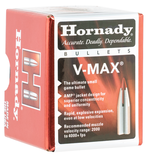 Hornady V-Max bullets are varmint-specific reloading projectiles featuring a polymer tip design that increases ballistic coefficient and initiates expansion at velocities as low as 1600 fps. Each box contains 100 bullets with a jacketed lead construction and match-grade jacket concentricity for consistent accuracy. These .204" diameter, 40-grain bullets deliver ultra-flat trajectories and explosive expansion suitable for precision rifle reloading.