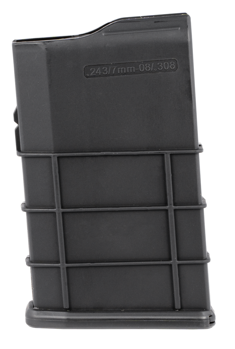 Detachable polymer magazine for .308 Win, 7mm-08 Rem, and .243 Win calibers with 10-round capacity. Designed for Remington 700 BDL rifles and compatible with Howa 1500 series firearms. Black finish with dimensions of 11.6" length, 3.9" width, and 2.1" height.