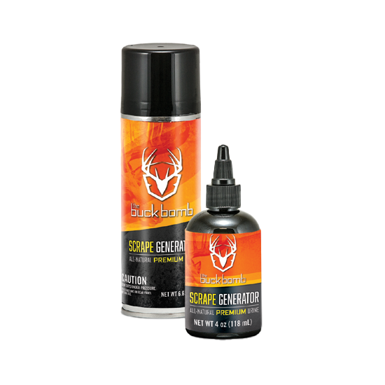 Buck Bomb Scrape Generator is a 4oz scent product designed to simulate deer scrapes and attract bucks during hunting season. This aerosol-based scent control product is intended for use in hunting applications to enhance scent-based game attraction strategies.
