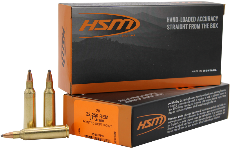 HSM Varmint ammunition in 22-250 Remington features 55-grain soft point bullets with a muzzle velocity of 3590 fps and muzzle energy of 1574 ft lbs. Each box contains 20 rounds of brass-cased centerfire rifle ammunition, ideal for varmint hunting applications.