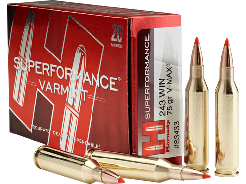 HSM Varmint ammunition in .243 Winchester features a 75-grain Hornady V-Max bullet designed for precision varmint hunting. This centerfire rifle ammo delivers 3,300 fps muzzle velocity and 1,814 ft-lbs of energy, with 20 rounds per box and 25 boxes per case.