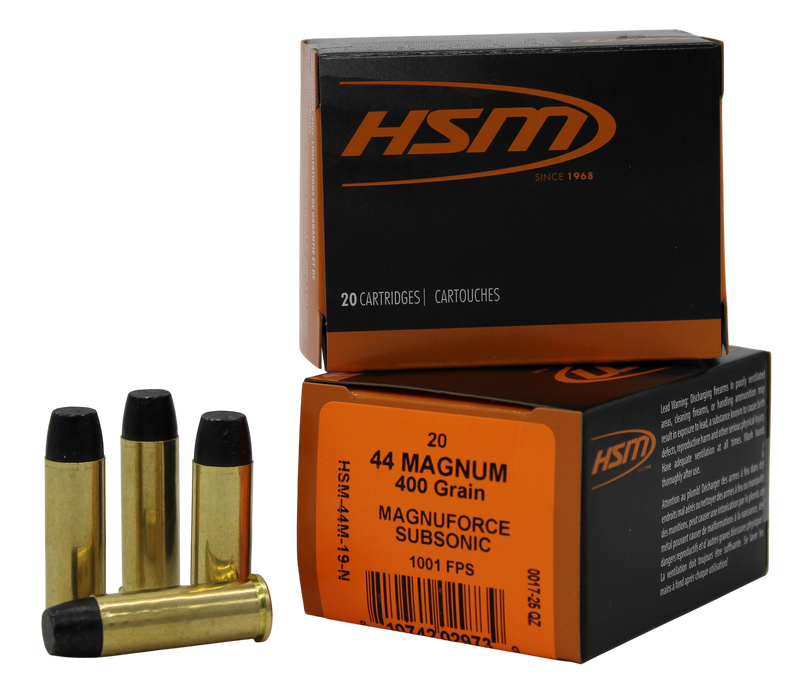 HSM subsonic 44 Rem Mag ammunition featuring 400-grain hard cast long flat nose bullets with Hi-Tek coating. Loaded to 1001 fps muzzle velocity producing 890 ft-lbs of energy, delivering reliable performance in handguns and lever-action rifles. Sold 20 rounds per box, 20 boxes per case.