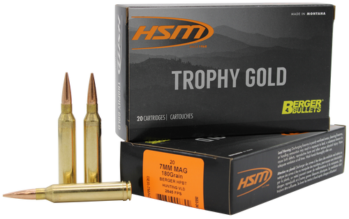 HSM Trophy Gold ammunition in 7mm PRC features a 180-grain Berger Match Hunting VLD projectile, designed for precision rifle hunting applications. This match-grade ammunition comes in 20-round boxes with 10 boxes per case for convenient bulk purchasing.
