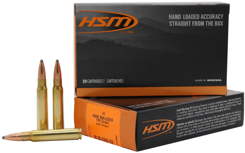 HSM 8mm Mauser ammunition loaded with 195-grain soft point bullets. Packaged in boxes of 20 rounds per box, 20 boxes per case. This centerfire rifle ammunition is hazmat-regulated for both ground and air transport.