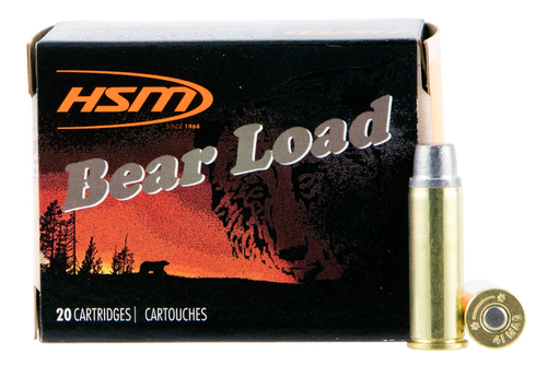 HSM Bear Load ammunition in .44 Rem Mag features 305-grain hard-cast gas-checked bullets designed for maximum penetration on game. Loaded to 1260 fps muzzle velocity with 1075 ft-lbs of energy from an 8.25-inch barrel. Comes in 50-round boxes, 10 boxes per case.