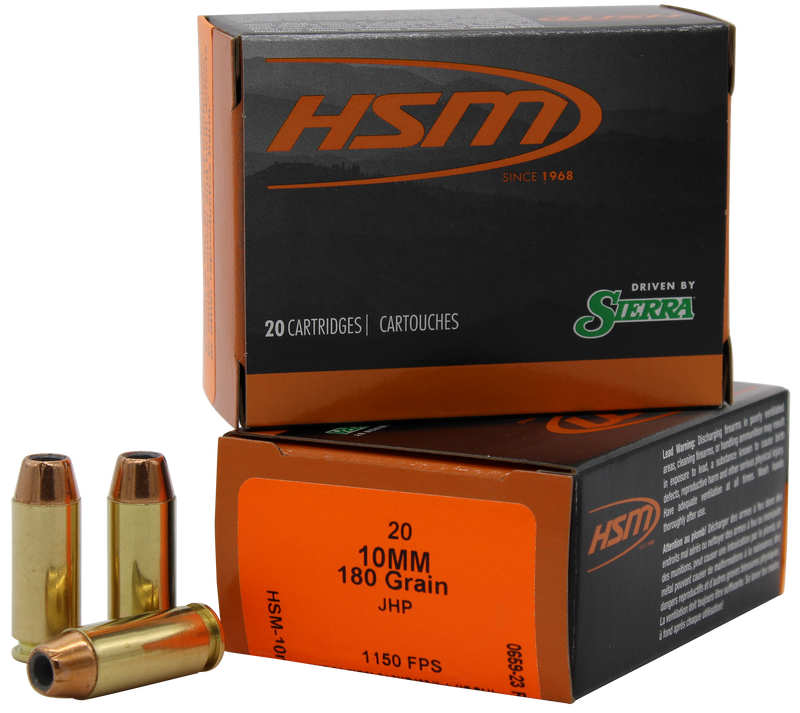 HSM Pro Pistol ammunition in 10mm Auto features 180-grain jacketed hollow point bullets designed for handgun hunting applications. Each box contains 20 rounds of precision-loaded ammunition with premium Sierra bullets, offering reliability and accuracy for hunting handguns. Brass casing with 20 boxes per case.