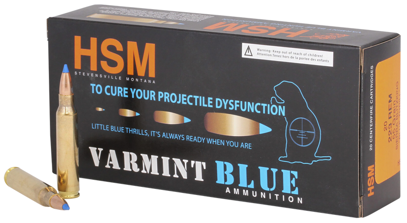 HSM Varmint ammunition in .223 Rem with 54gr Sierra BlitzKing bullets delivers 3120 fps muzzle velocity and 1189 ft-lbs of energy for precision varmint hunting. Brass cased and boxer primed for reliable performance. Packaged 20 rounds per box, 25 boxes per case.