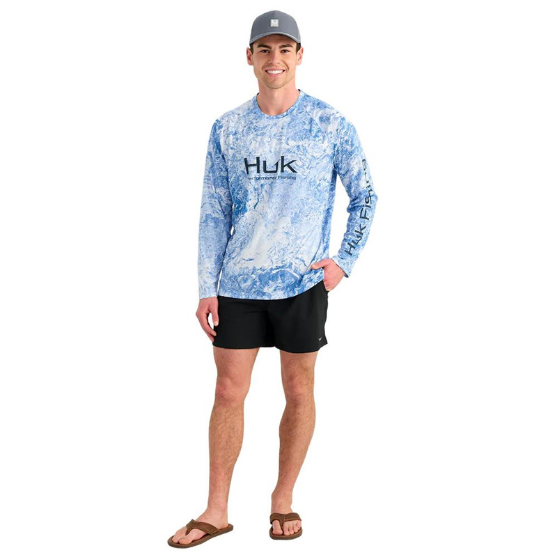 This long sleeve performance shirt features an exclusive Mossy Oak Pursuit pattern designed for water sports and fishing. Built with HUK Performance Technology to handle elements on the water, it offers a color palette inspired by choppy seas and gray skies. Available in size Large with drop-ship delivery options including economy, ground, second day air, and next day air.