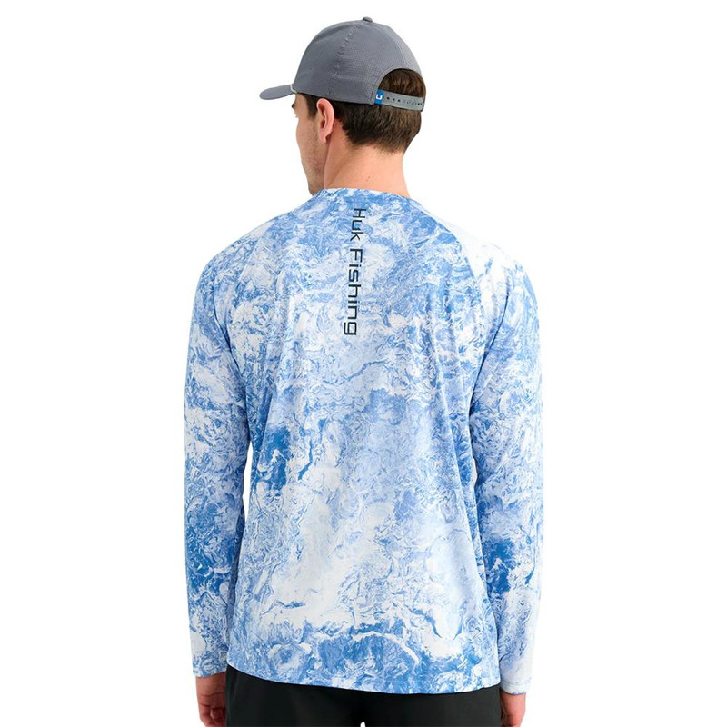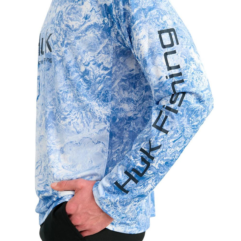 This long sleeve crew shirt features an exclusive Mossy Oak Pursuit pattern designed for water-based activities with a color palette reflecting choppy seas and gray skies. Built with HUK Performance Technology to handle challenging weather and water conditions. Available in size M with drop-ship delivery options including next day air and ground shipping.
