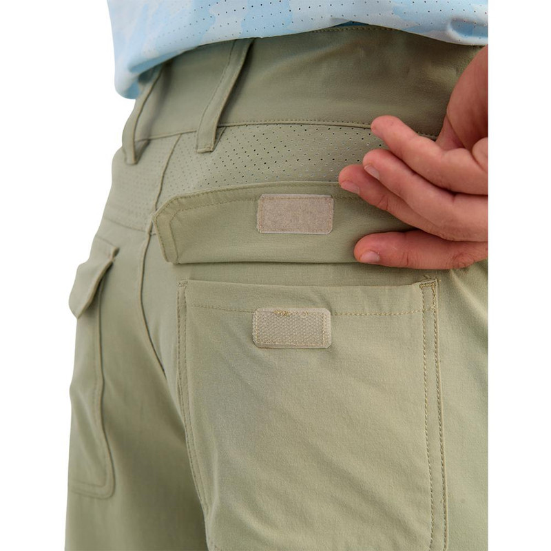 The HUK Next Level 7" fishing shorts feature a 55% cotton, 35% polyester, and 10% spandex blend with superior stretch and quick-drying properties. SPF-rated sun protection, adjustable waistband, and gusseted crotch design provide comfort and mobility for fishing and outdoor activities.