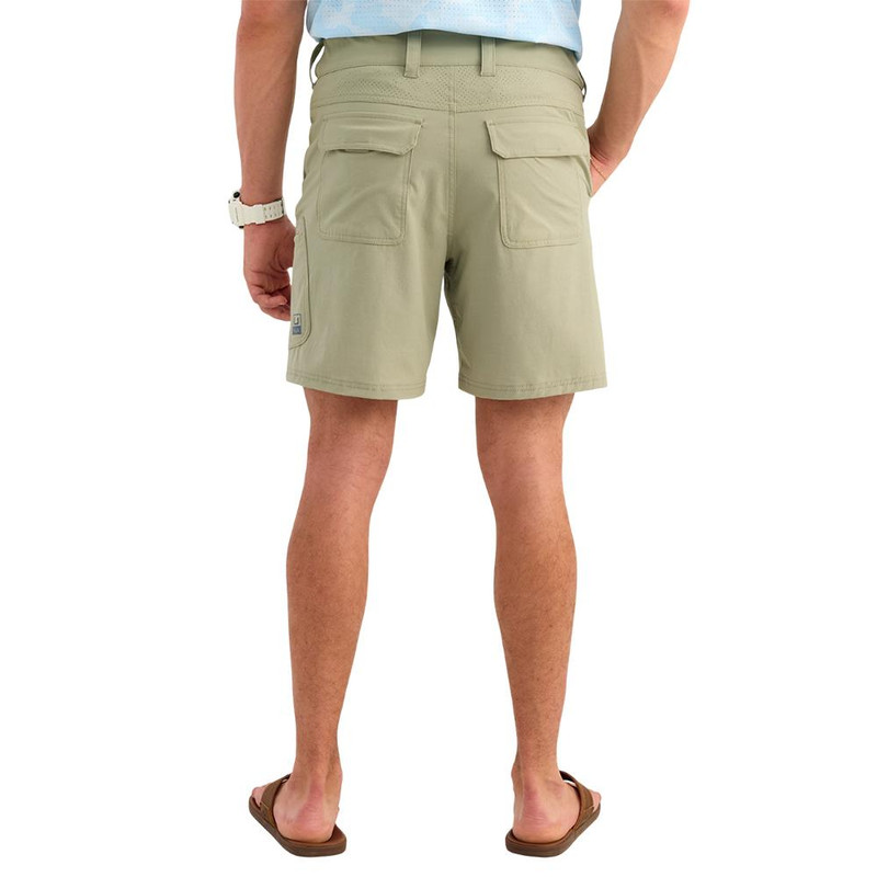 These fishing shorts feature a 7-inch inseam with superior stretch quick-drying fabric and stain release treatment. The adjustable waistband and gusseted crotch provide maximum mobility, while SPF-rated material offers sun protection. Made from a blend of 55% cotton, 35% polyester, and 10% spandex.